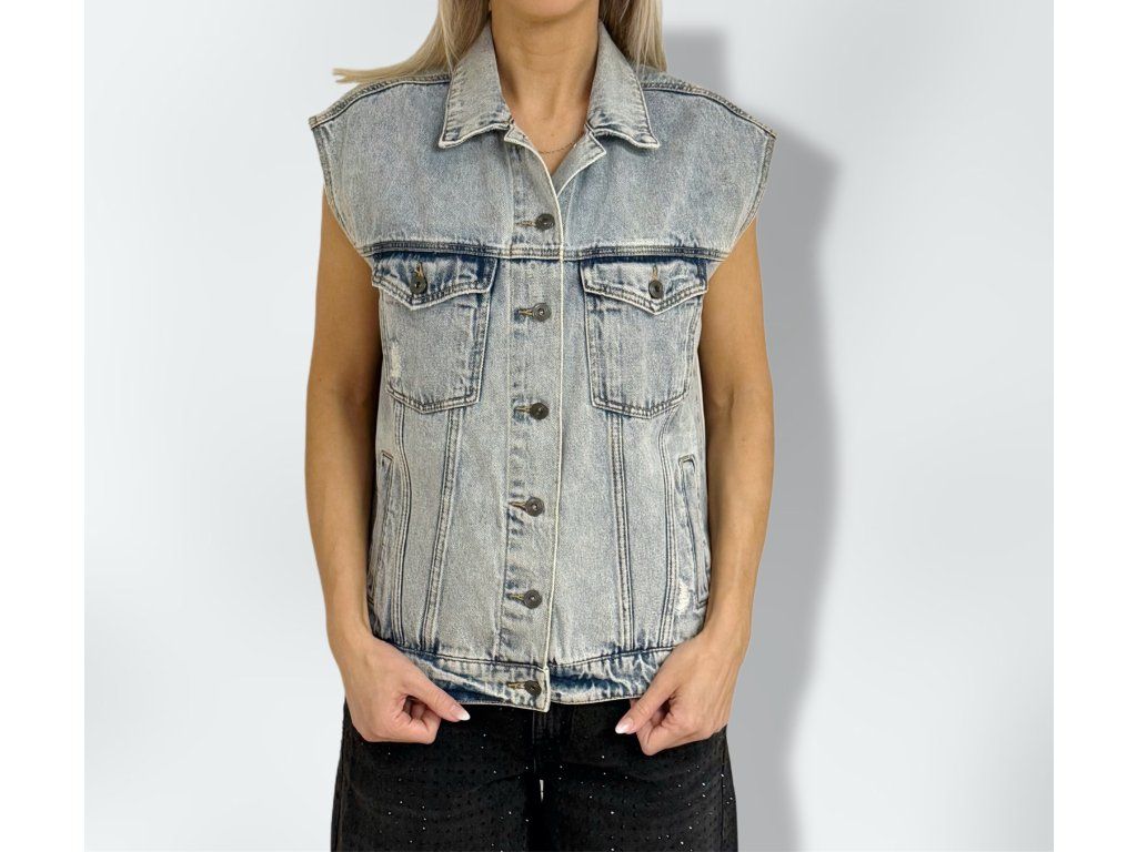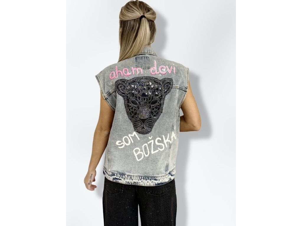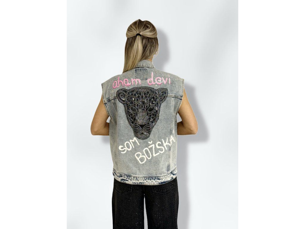 Denim vesta SOM BOŽSKÁ s nášivkou a ručně psaným designem